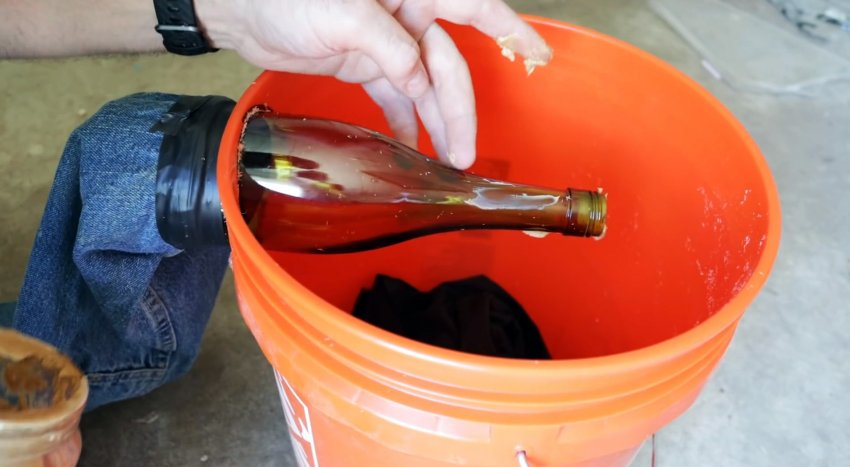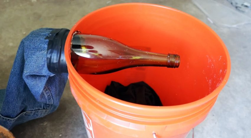 В стенке ведра необходимо прорезать отверстие под диаметр бутылки, чтобы та вставлялась впритирку. Выпиливать нужно как можно выше.