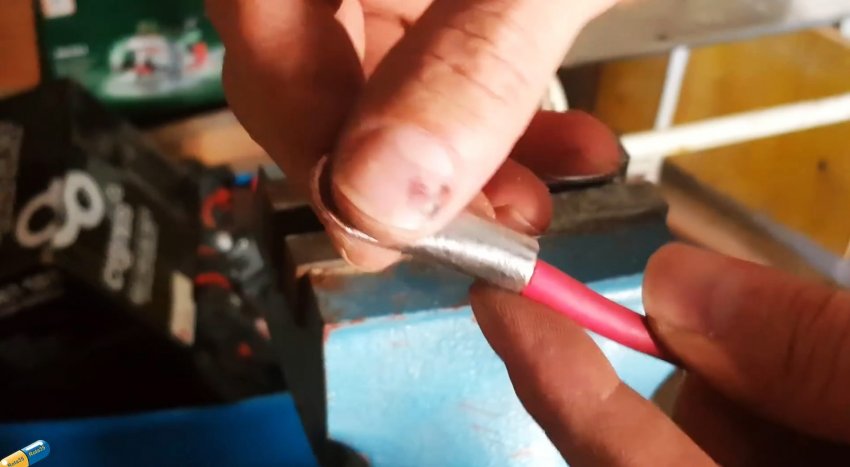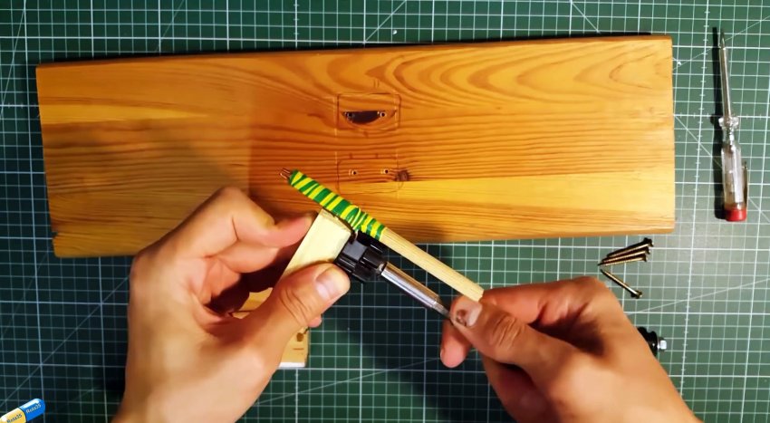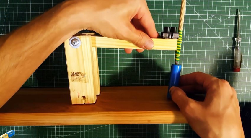 К деревянной палочке требуется примотать изолентой 2 куска медной проволоки, как на фото. Это будут электроды для сварки. Расстояние между их контактными концами должно быть 3-4 мм. На свободные края электродов зажимается клеммная колодка.