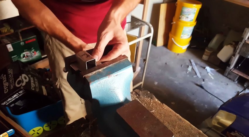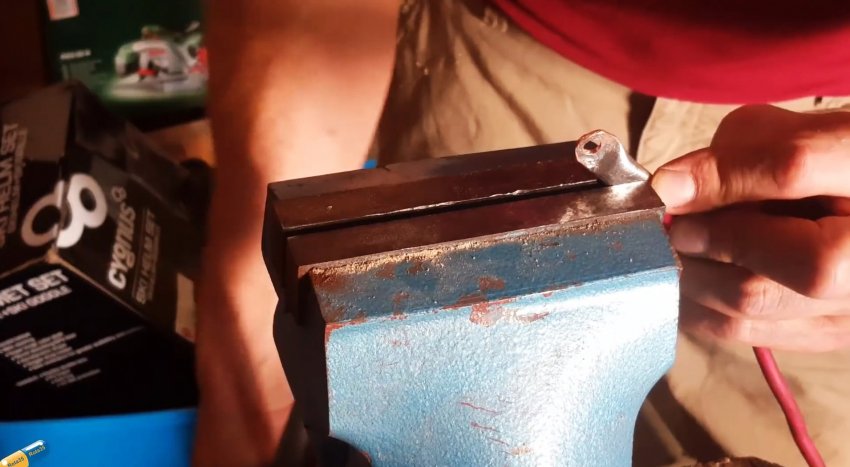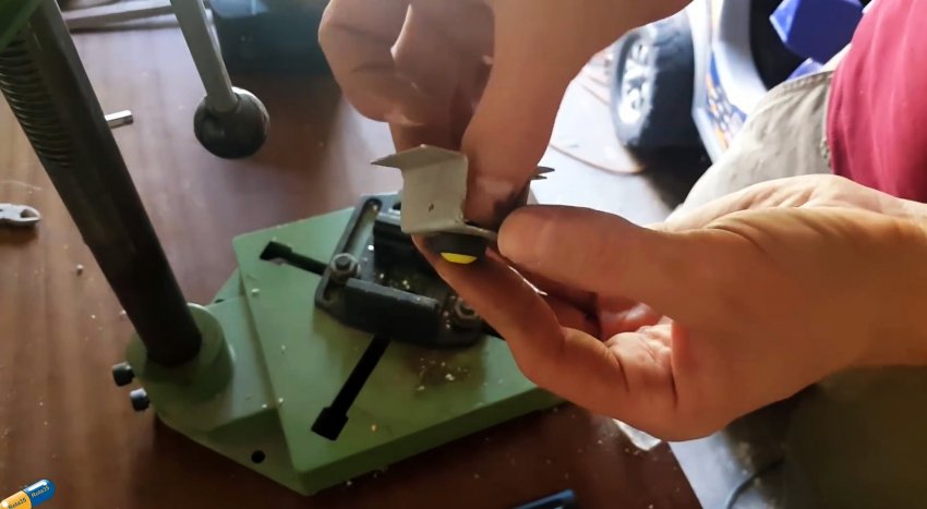Из любого тонкого листового металла нужно изогнуть кронштейн для установки кнопки. Он делается П-образным с полками. В нем просверливается отверстие под кнопку.