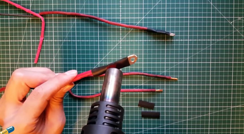 Соединение изолируется термоусадкой. Также нужно будет подготовить еще такой же отрезок провода, зачистить его края, и поставить термоусадку перед оголенными жилами.