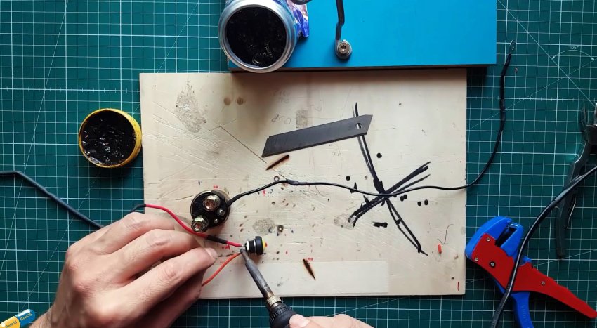 На подошву устанавливается скоба с кнопкой. Та в свою очередь подсоединяется к реле. Силовой контакт последнего с помощью провода с концевой клеммой нужно подключить к клеммной колодке электродов. Аналогичный кабель прокладывается от реле к плюсу на автомобильной батарее. К нему же нужно подвести и кнопку.