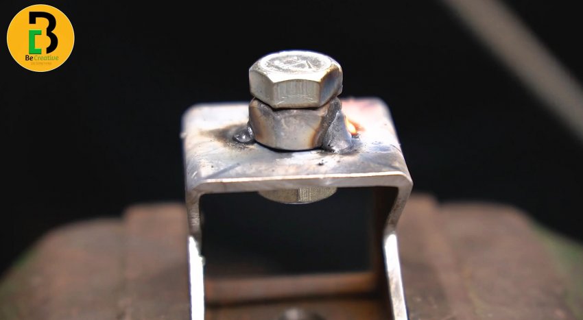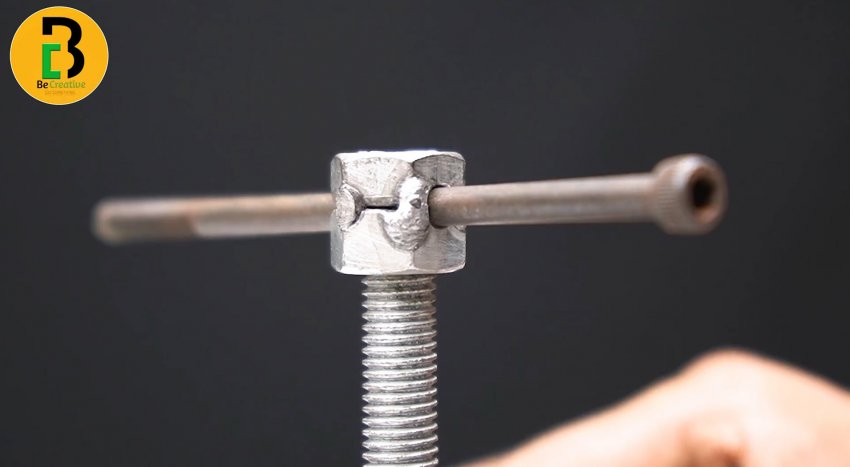 На оставшуюся стенку с отверстием необходимо приварить гайку так, чтобы сохранить возможность закручивать в нее болт. То есть, важно не залить сваркой резьбу, и выставить отверстия соосно.