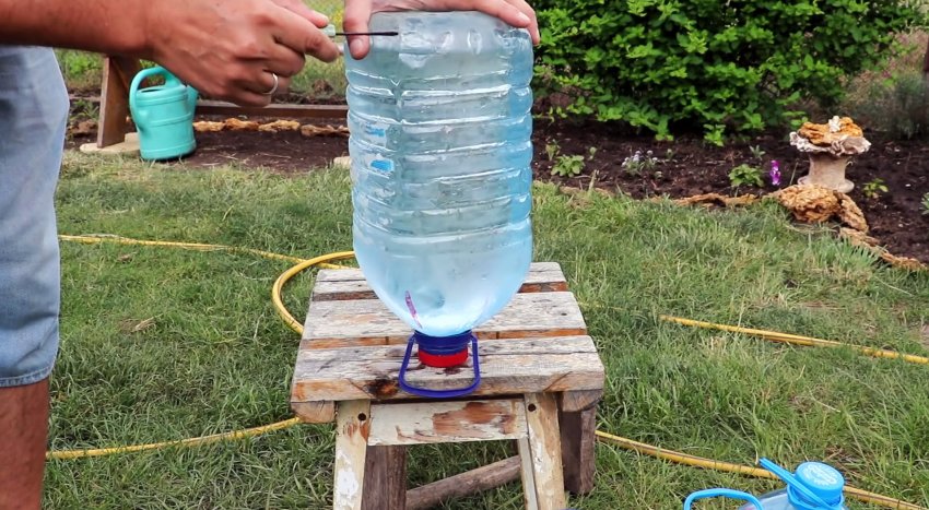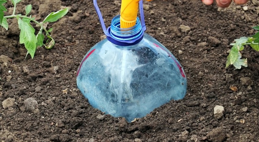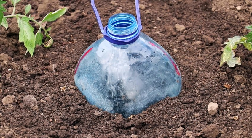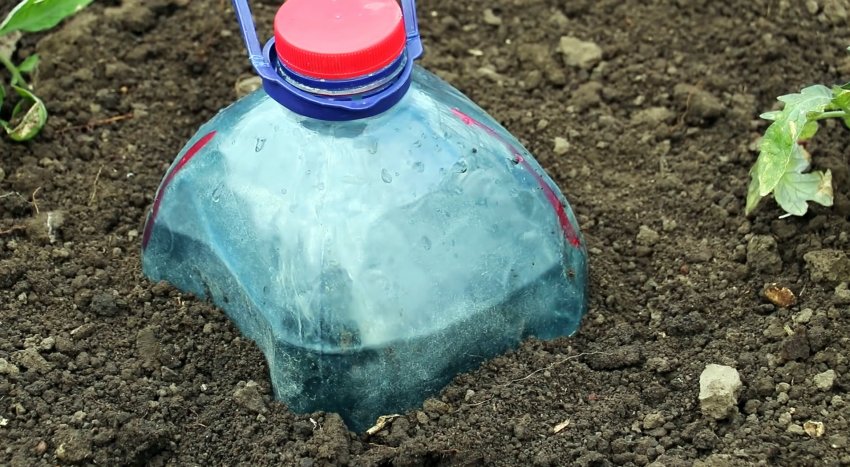 Бутыль зарывается в грунте. Затем его крышка снимается, и благодаря доступу воздуха вода из него быстро уходит в грунт.