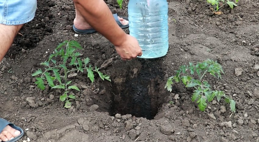 Суть метода в том, что в грунт возле растений частично закапывается ПЭТ бутыль с небольшими отверстиями в стенках, сквозь которые медленно стекает вода. Возле него всегда будут влажно, что и нужно неокрепшим кустам. Для изготовления такой системы необходимо заполнить бутыль водой, и закрыть его крышкой. На нем у горлышка ставятся метки, напротив которых будут сделаны отверстия для полива.