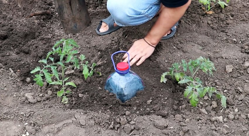 Это позволяет пролить почву вокруг. Затем бутыль заправляется заново, и закрывается крышкой. С ней вода будет уходить медленно, питая корни растений долгое время.
