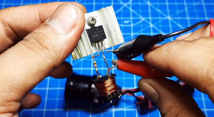Теперь берем транзистор IRFZ44N, и припаиваем к его левой ножке резистор 22 Ом. Одинарные края самодельной обмотки на катушке нужно спать с центральной ножкой транзистора и резистором.