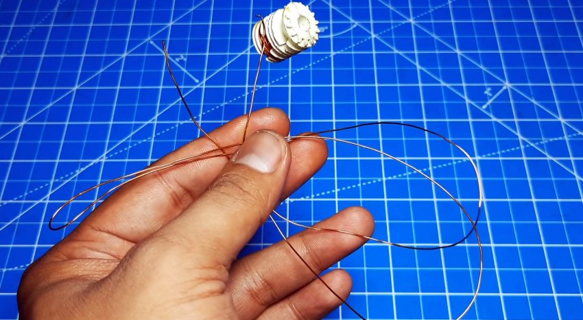 Далее берем эмалированную медную проволоку и складываем ее пополам. Ее петля перекручивается несколько раз, и прикладываться к катушке.