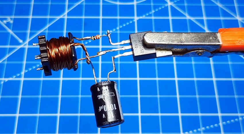 Минусовой провод от нее подключаем к ножке конденсатора со стороны транзистора, а плюсовой на ножку от катушки.