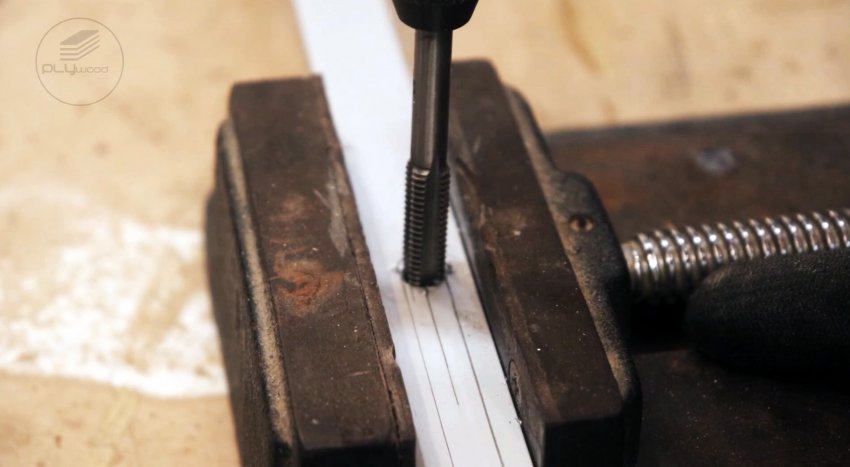 Переносим на поверхность алюминиевого отрезка контур прорези и отмечаем центр ее закругления. В этой точке в алюминиевых отрезках сверлим отверстие и нарезаем резьбу.
