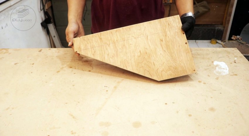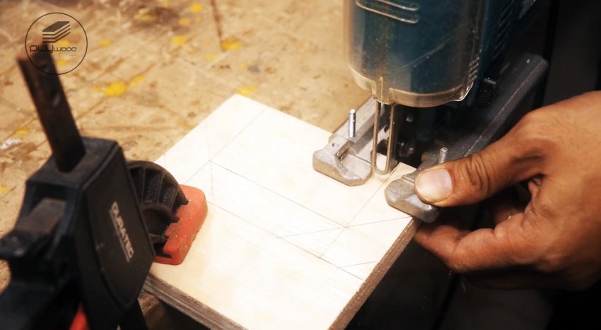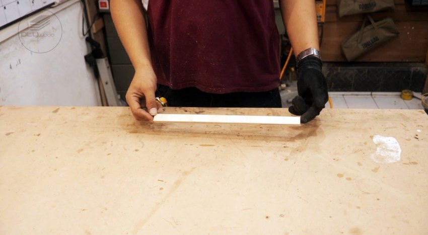 Откладываем от углов, расположенных по диагонали, по длинной стороне 150 мм, по короткой – 65 мм. Соединяем эти точки прямой линией и отрезаем дисковой пилой.