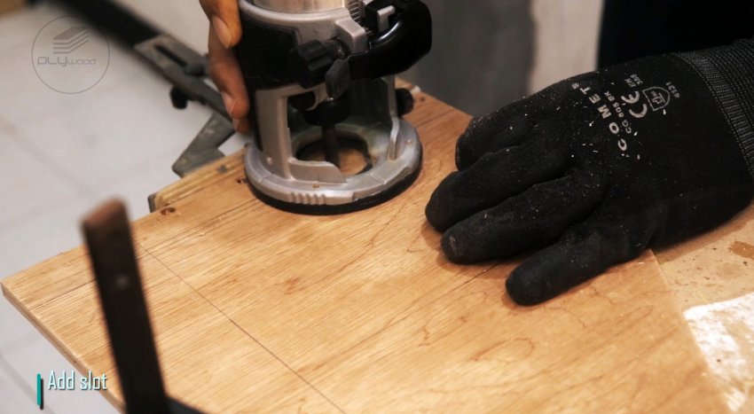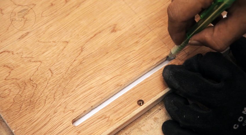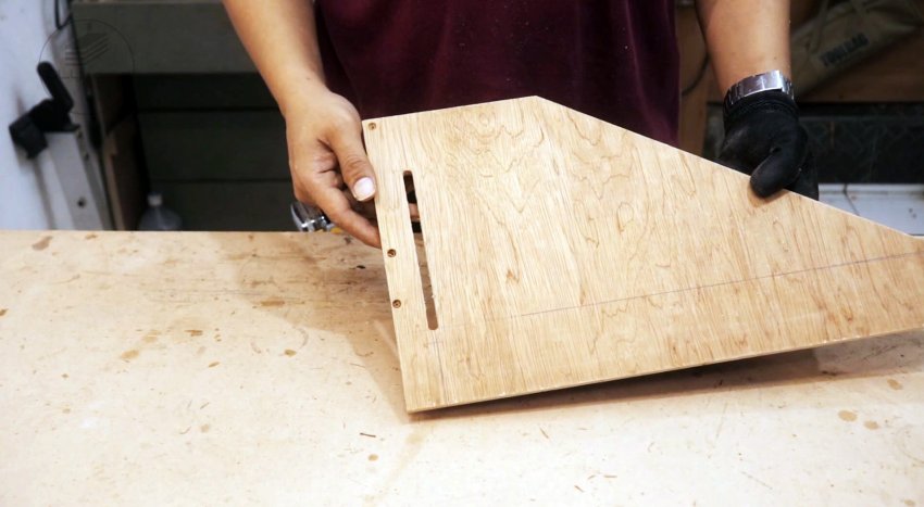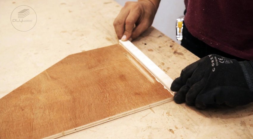Размечаем и вырезаем ручку из куска многослойной фанеры с помощью лобзиковой пилы. После снятия кромок фрезером, крепим ее к направляющей шине с помощью клея и шурупов.