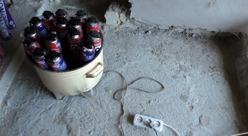Утеплитель в баллоне встряхиваться 1-3 минуты согласно инструкции. Температура в помещении где проводятся работы должна быть не менее чем +5 градусов Цельсия. Температура самих баллонов должна быть в пределах 18-25 градусов Цельсия. Если они холодные, то их можно выдержать в ведре с теплой водой.