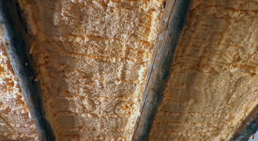 После этого утеплитель наносится тонким слоем полосками. Он очень быстро увеличивается в объеме, создавая сплошной пористый кожух.
