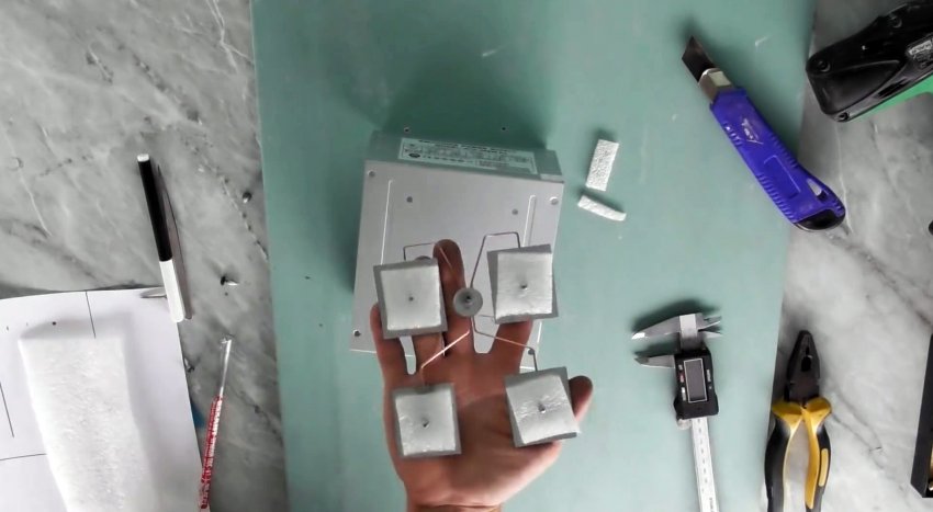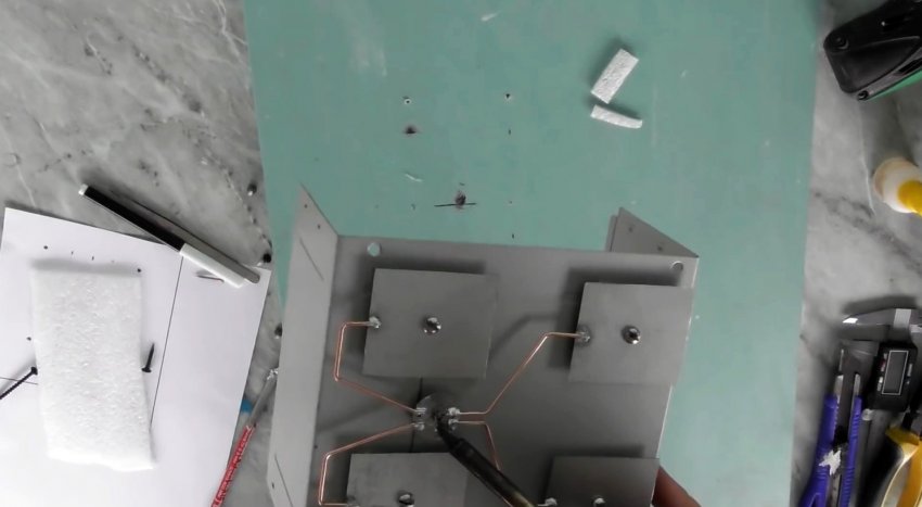 Размечаем центр каждого прямоугольника, и, предварительно наживив гвоздем, просверливаем отверстия. Патчи для будущей антенны готовы.