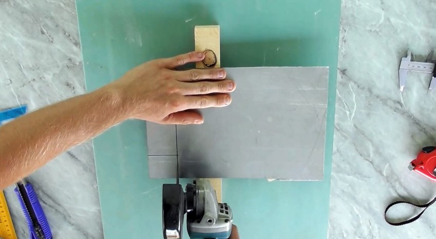 На листе оцинкованной стали маркером размечаем 4 прямоугольника 49?42 мм и круг диаметром 18,5 мм. Болгаркой или ножницами по металлу вырезаем заготовки. Лишние заусенцы убираем строительным ножом.