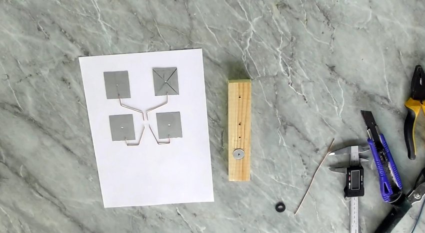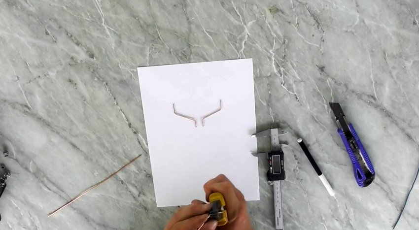 Медную проволоку очищаем от изоляции. Кусачками отрезаем 4 одинаковых кусочка длинной 5,5 см. каждый. Плоскогубцами сгибаем их как показано на фото ниже: