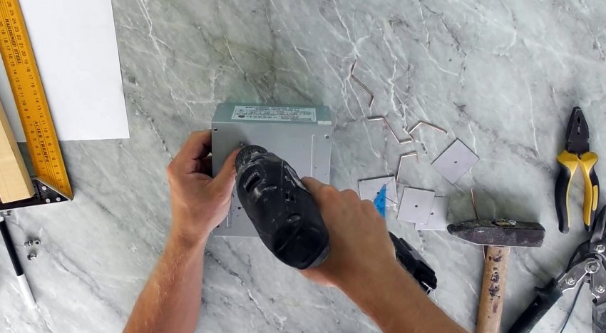 Разбираем старый блок питания — нам понадобится только задняя крышка. В ней просверливаем отверстия для крепления патчей. Наждачной бумагой или ножом убираем заусенцы.