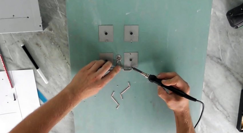 С помощью паяльника наносим немного олова в центр одной стороны каждого прямоугольника. Тщательно залуживаем концы медной проволоки.