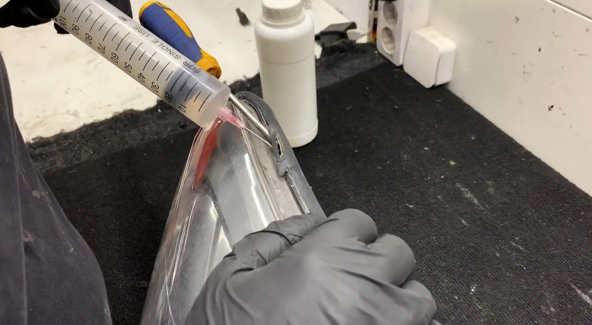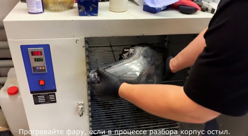 Кладем фару в печь на 20 минут, температура нагрева около 110 градусов. Это никак не повлияет на полиуретановые герметики, но позволит сделать пластик фартука более мягким.