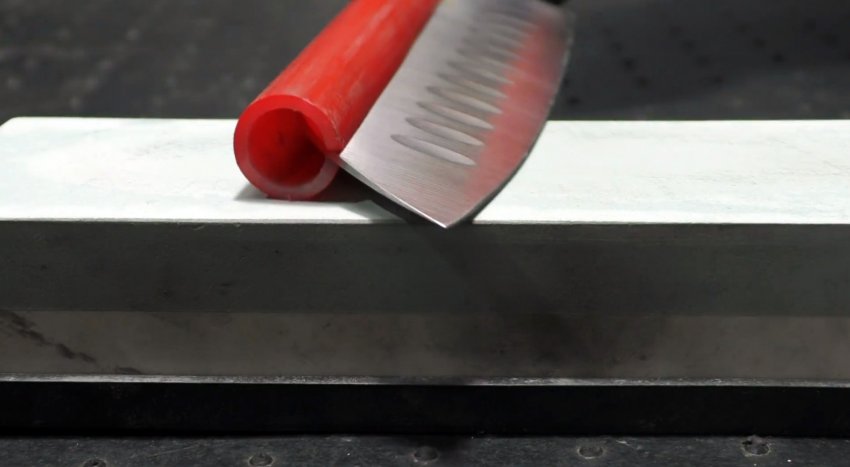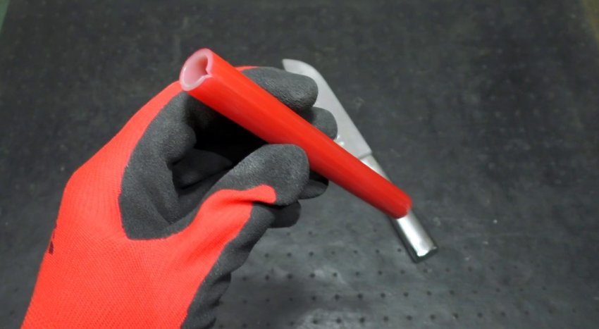 Не каждому человеку удается в процессе этой работы обеспечить правильный угол заточки, поэтому многие не в состоянии обеспечить хорошую заточку своего ножа. Для обеспечения контроля нужного угла заточки воспользуемся пластиковой трубкой для теплых полов диаметром 16 мм.