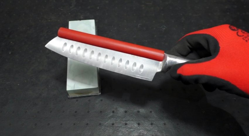 Одеваем разрезанную в продольном направлении трубку на обух ножа. Теперь в процессе заточки трубка скользит по поверхности камня и обеспечивает одинаковый угол заточки лезвия с двух сторон. Заточка ножа превращается в простое занятие, с которым может справиться даже хозяйка.