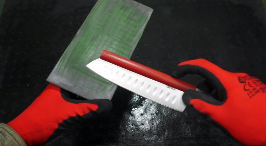 Но, чтобы довести остроту ножа до состояния бритвы, лезвие нужно отполировать с помощью пасты ГОИ. Для этого пасту наносим на рабочую поверхность малярной терки и повторяем движения, как и при заточке на камне.