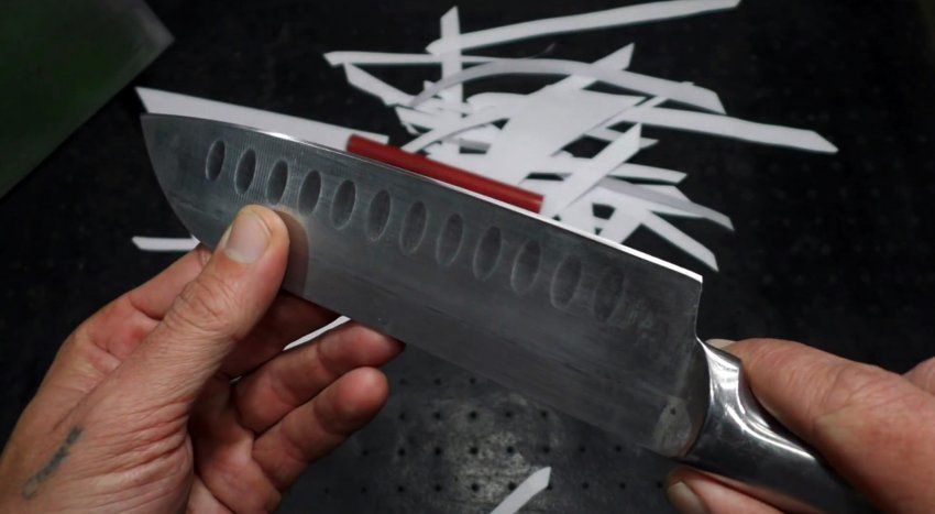 Проверяем степень заточки, повторяя резку листа бумаги на весу. Это получается очень просто и легко. Таким способом с помощью точильного камня, куска трубы, строительной терки и пасты ГОИ можно затачивать как новые, так и старые ножи. Результат всегда будет положительным.