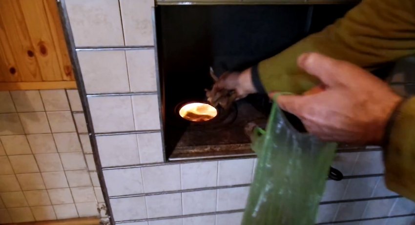 - На охваченные пламенем дрова высыпаются картофельные очистки.