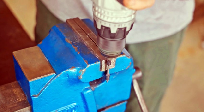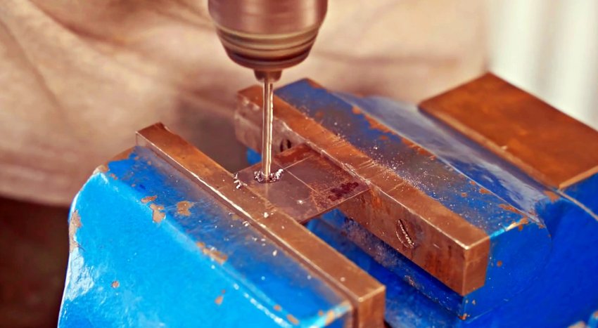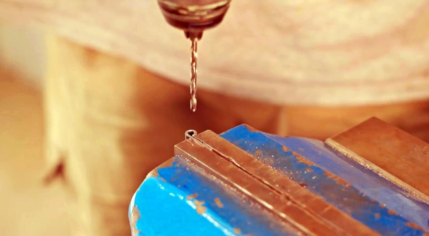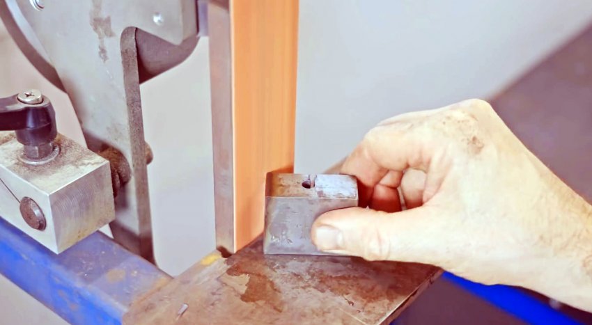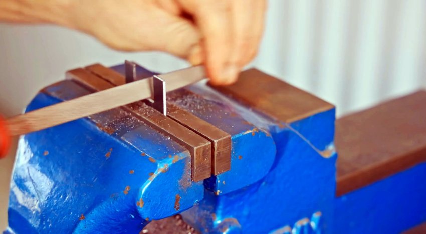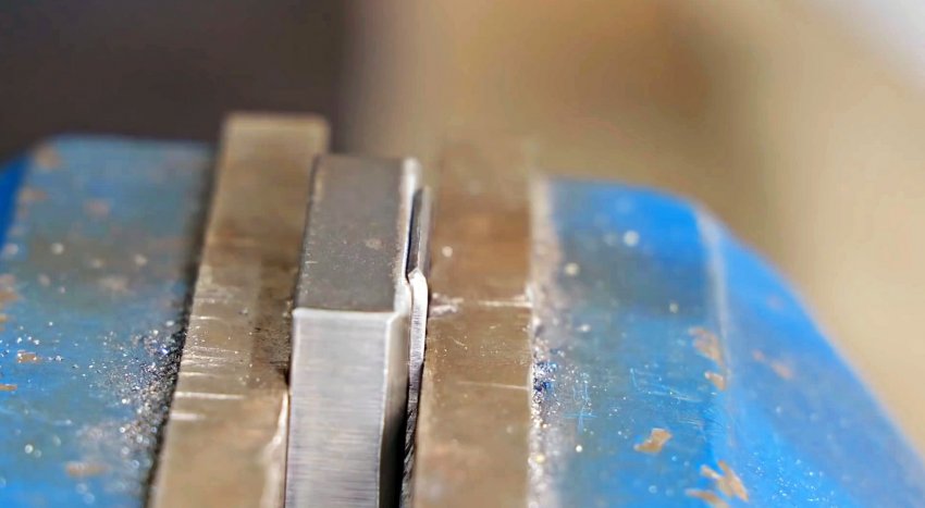Одну кромку пластины сгибаем молотком для облегчения изгиба металла в матрице, смазываем конец пластины маслом и давим на нее сверху винтовым прессом или губками тисков.