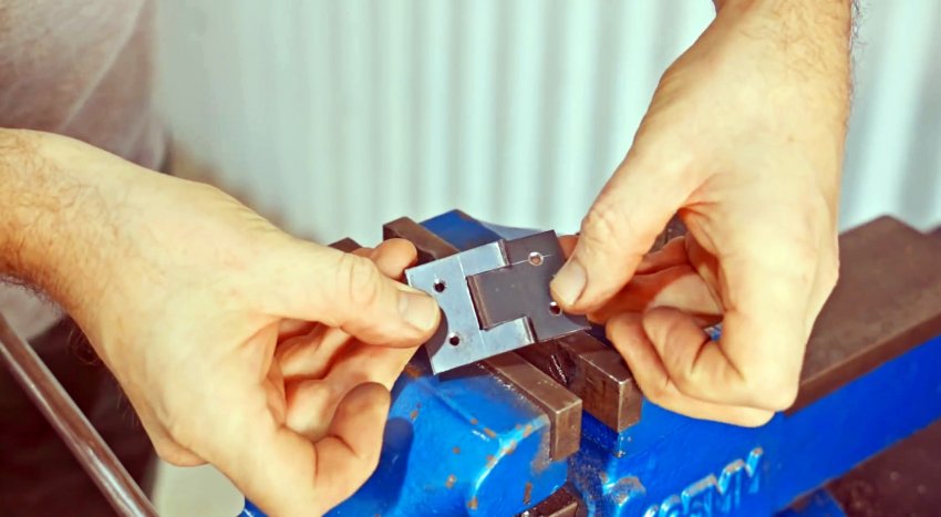 Выполним боле сложные петли – накладные и петли-бабочки. Для этого от полосы листового металл отрезаем 4 одинаковые заготовки, намечаем и сверлим отверстия для крепления, а также делаем вырезы и выступы с применением различных инструментов.