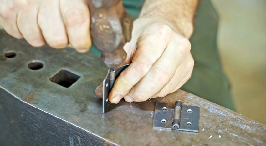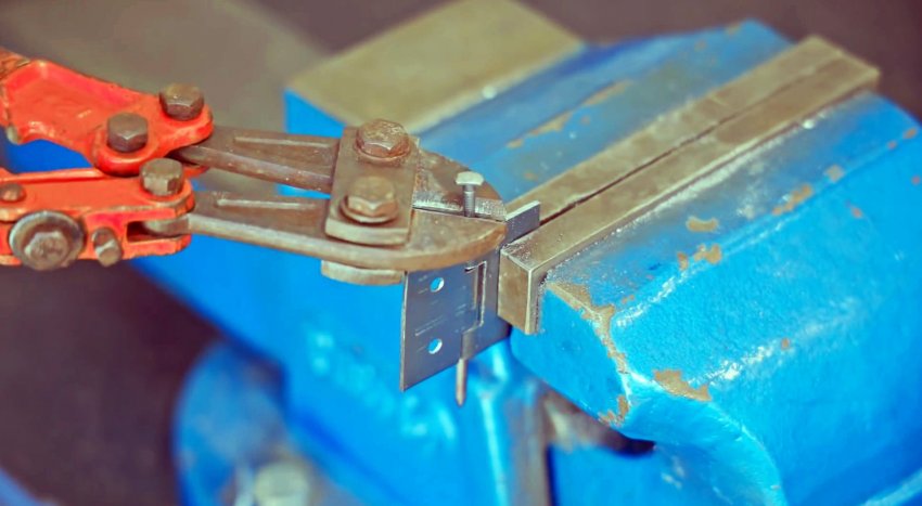Совмещаем шарниры крыльев петли и соединяем их осевым штифтом (у нас – гвоздем) диаметром 3 мм. Выступающие концы штифта откусываем ножницами-кусачками и укорачиваем на гриндере.