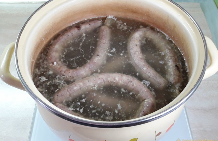 9. В большой кастрюле вскипятить воду. Опустить туда колбасные заготовки и варить 20-25 мин. в зависимости от их диаметра.