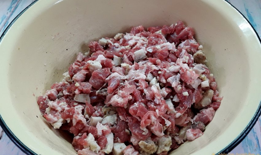 1. Немного подмороженное (чтобы легко резалось ножом) мясо нарубить мелкими, насколько это возможно, кубиками.