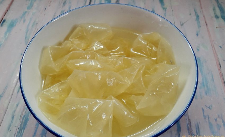 6. Коллагеновую оболочку положить в обычную воду - так она станет более пластичной и удобной в работе. Если натуральная черева хранилась в соли, то ее нужно тщательно промыть.