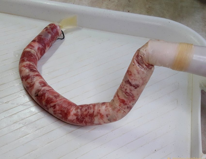 7. Со шнековой мясорубки снять нож и решетку. Поставить насадку для колбасы (за ее неимением можно воспользоваться отрезанной верхней частью пластиковой бутылки и проталкивать фарш пальцем или обратной стороной чайной ложки). Отрезать желаемую длину оболочки и надеть ее, как чулок, на насадку. Кончик пока не завязывать. После того, как проталкиваемые кусочки дошли почти до края оболочки, завязать конец суровой ниткой.