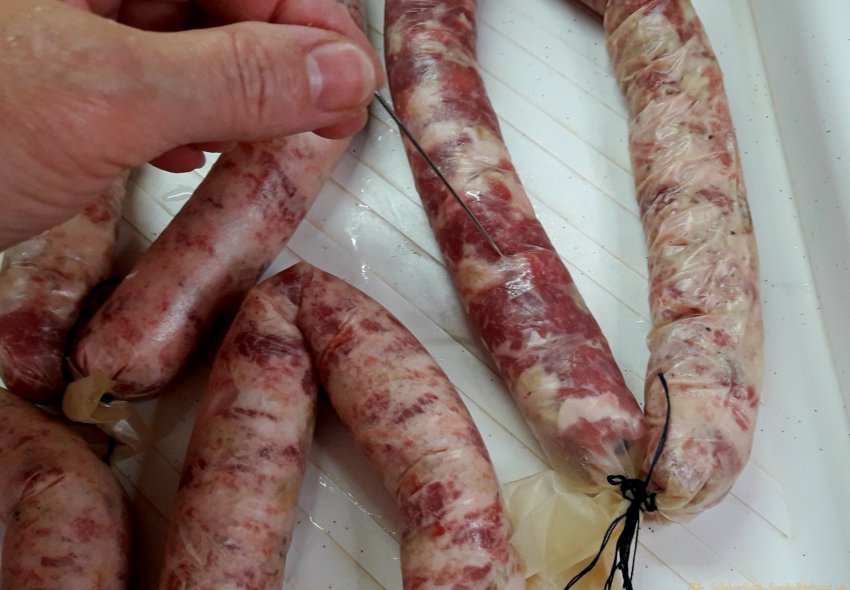 8. Колбасу набивать не упруго, она должна быть мягкой - после отваривания оболочка натянется и у плотно набитой колбасы она может лопнуть. По всей заготовке сделать проколы толстой иглой.