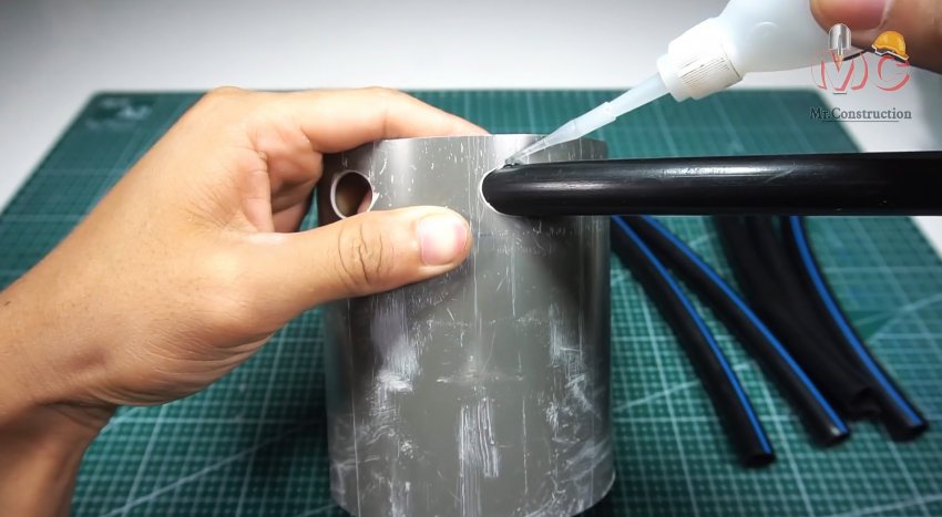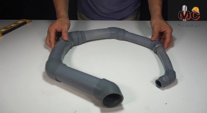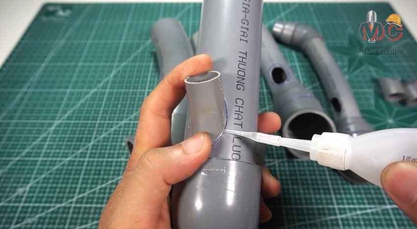 В трубах с вогнутой стороны вырезаем овальные отверстия, к которым приклеиваем и укрепляем герметиком трубки с косым срезом.