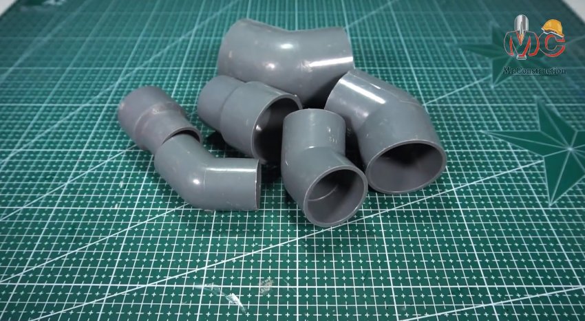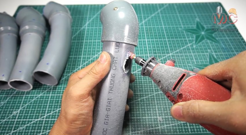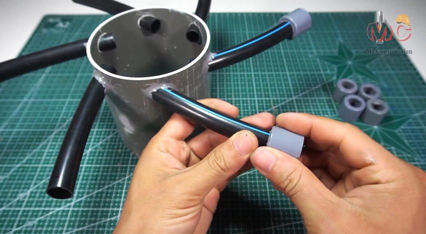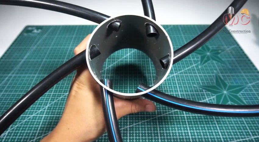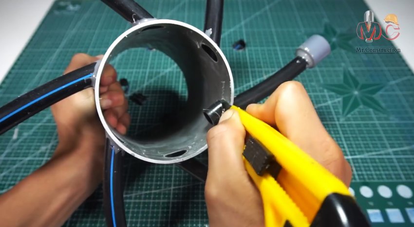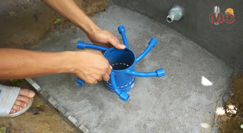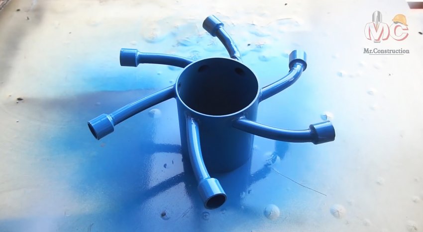 На конце большой по диаметру трубы сверлим равномерно по окружности 6 отверстий и вставляем в них на клей и герметик под углом 60 градусов согнутые трубки.