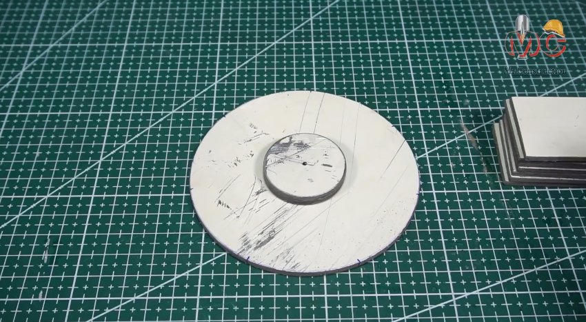 В центре дна нижнего бьефа впечатываем в бетон обечайку со спицами, которая будет в дальнейшем выполнять функцию основания для «генератора».
