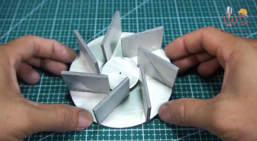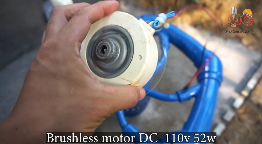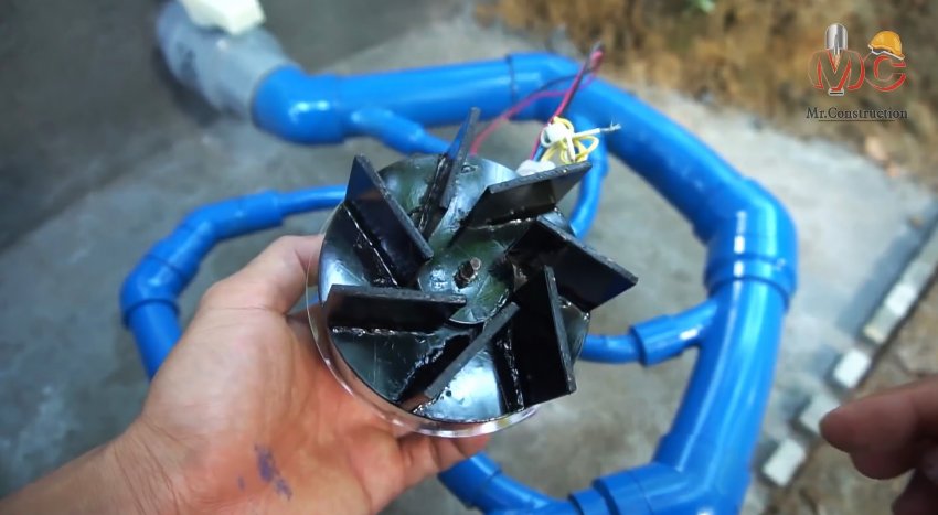 На вал электродвигателя насаживаем крыльчатку и вставляем в большую трубу. Провода электромотора подсоединяем к преобразователю тока и далее к потребителю – светодиодам или аккумуляторам.