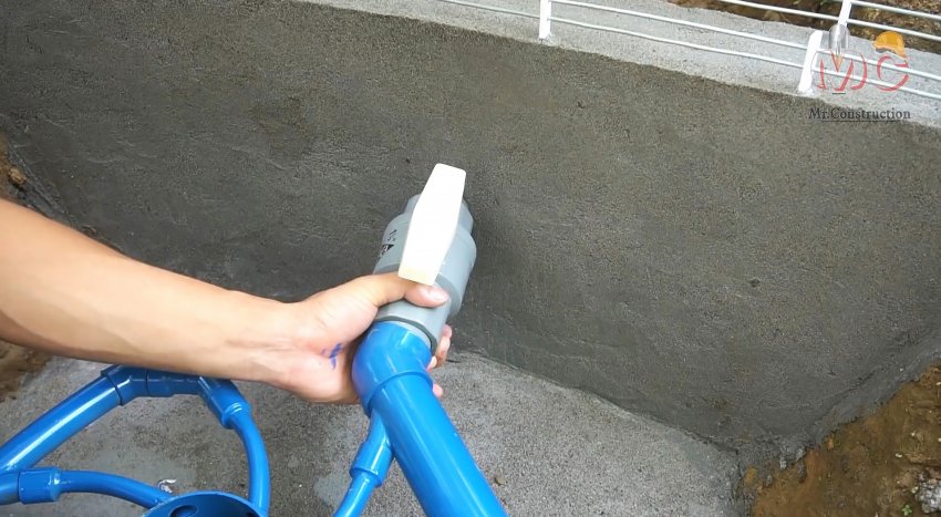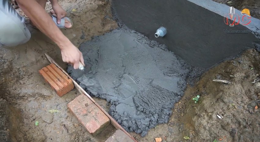 Между вторым и третьим рядом кирпичей по центру и поперек плотины замуровываем пластиковую трубу с сужением наружу. Возводим дамбу до уровня берегов русла, оштукатуриваем цементным раствором и бетонируем дно нижнего бьефа.