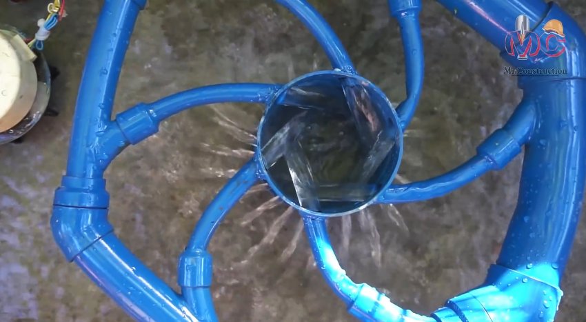 Отростки сужающегося контура заводим в колпачки изогнутых труб, а входное сечение с помощью прямоточного крана подключаем к выходу трубы, замурованной в плотине.