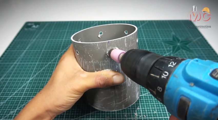 Этот сборный узел, с просверленными внизу по кругу множеством отверстий, устанавливаем в обечайку-основание до упора.