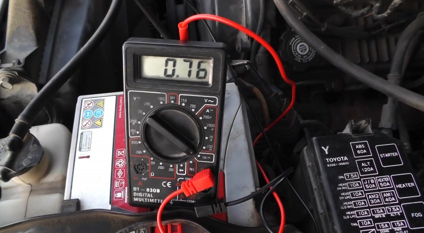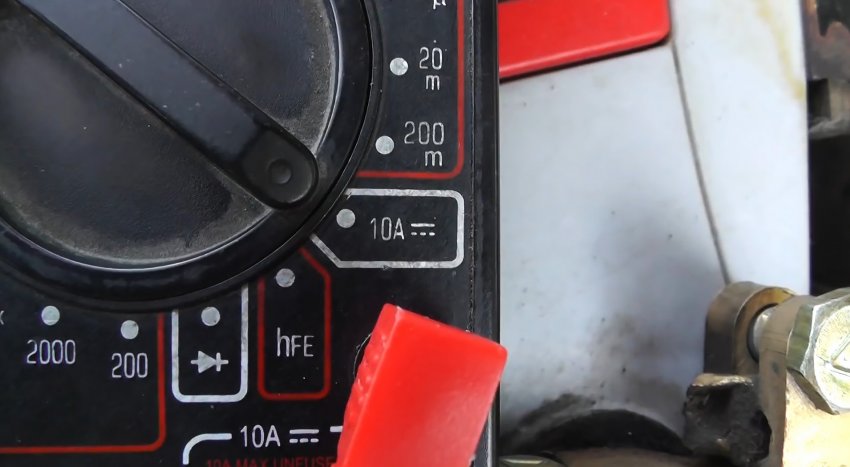 Второй щуп мультиметра присоединяется к снятой из аккумулятора клемме. Если с батареи снимался плюс, то важно смотреть чтобы клемма не контактировала с проводниками. Если есть такая возможность, то лучше снимать массу для подключения мультиметра, так будет безопасней для проводки.