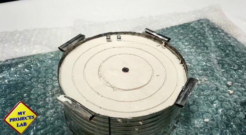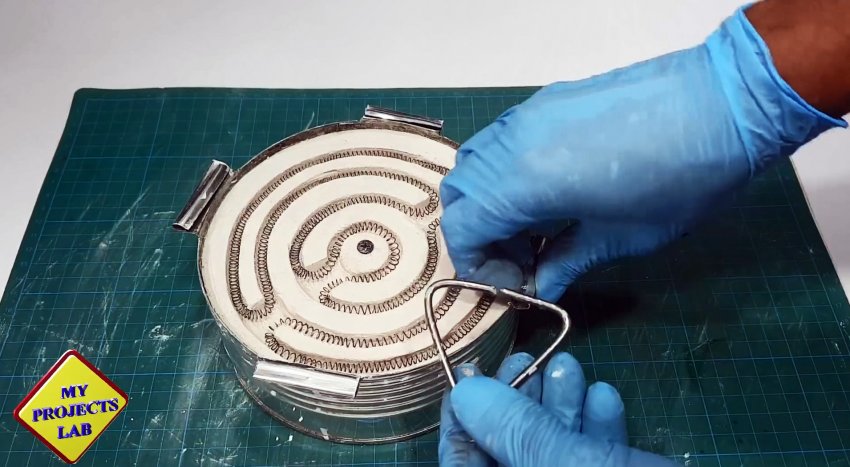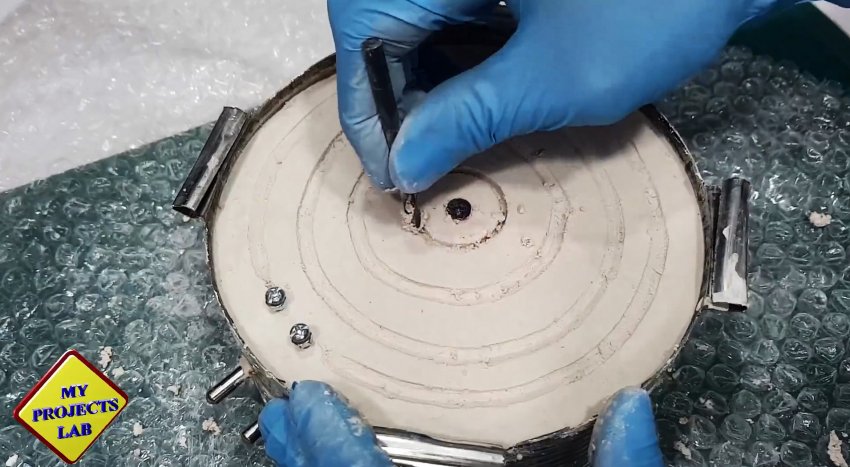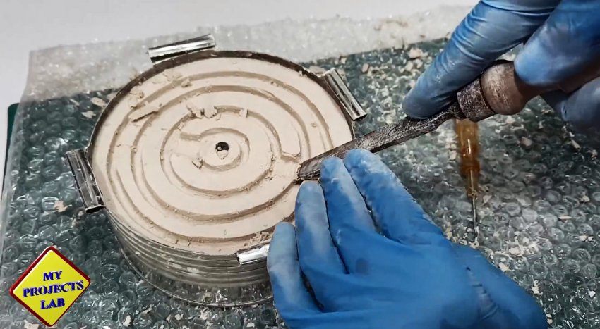 Когда гипс застынет, нужно нарезать пазы для спирали. Для этого в центр формы закручивался саморез. После чего циркулем по металлу на гипсе нарезаются бороздки кругами.
