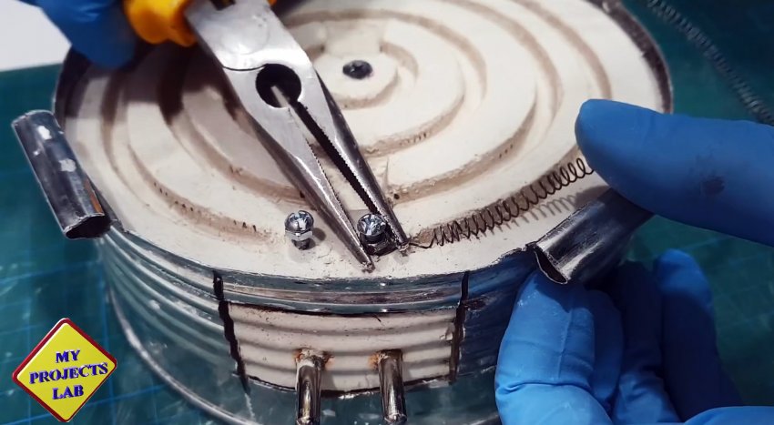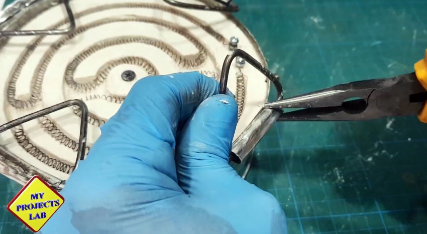 После этого в пазы закладывается нагревательная спираль. Ее концы зажимаются на выступающих винтах.