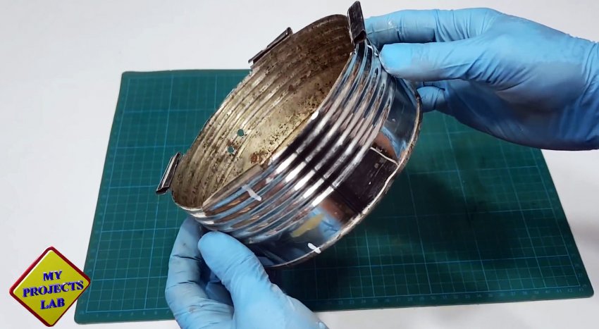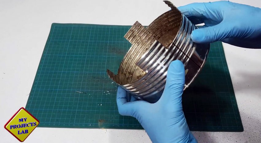 Укороченная банка размечается на 4 одинаковые сектора. Затем ее нужно обрезать по верхней окантовке на ширину изоленты, оставив зазубрины на метках. Эти выступы будут нужны для установки посуды.