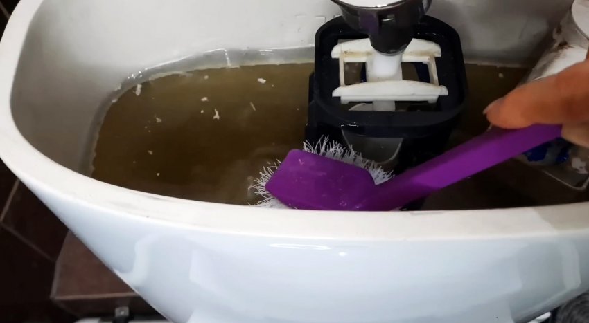 Сразу же начинается реакция взаимодействия водного раствора лимонной кислоты с известковым налетом на стенках бачка. Оставляем систему в покое примерно на 3 часа. Но перед этим с помощью щетки также удаляем налет с механизма набора и спуска воды.