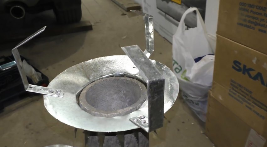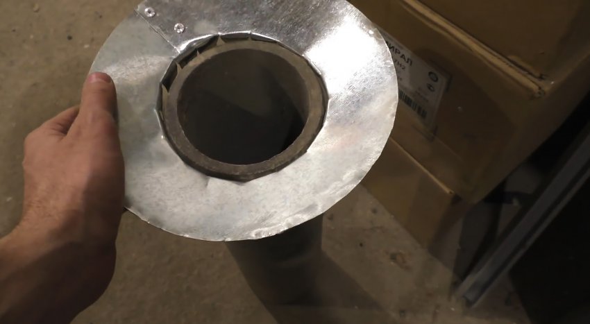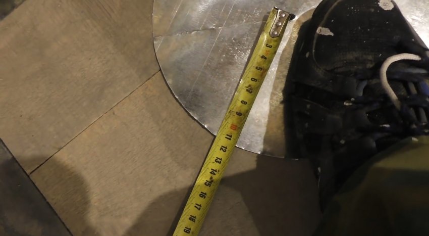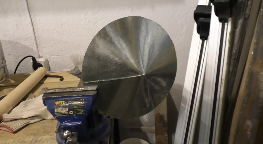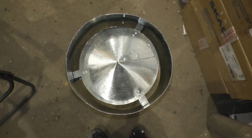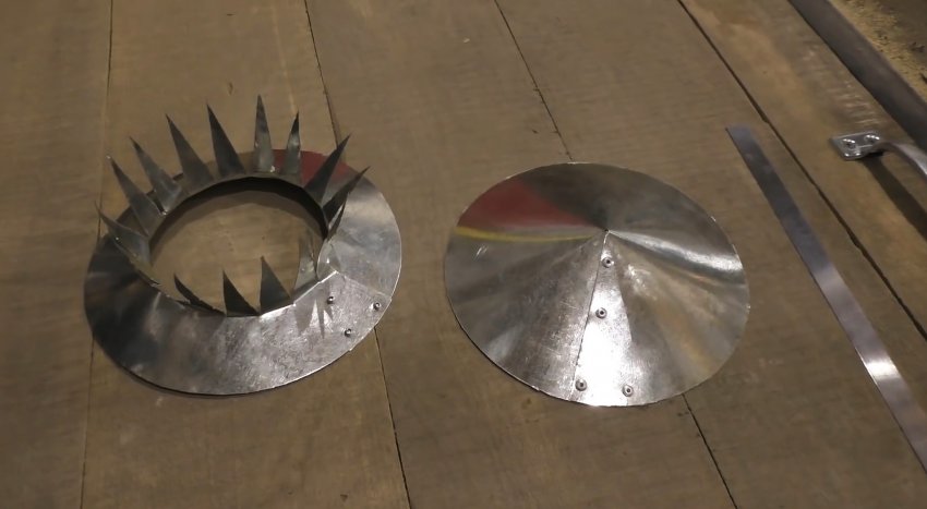 Из такого же диска изготавливается крепление дефлектора к трубе. Он распиливается от центра для образования треугольных зазубрин, которые выгибаются наружу. Здесь все рассчитывается так, чтобы получить отверстие под используемую на вытяжке трубу. Оставшуюся по окружности полосу металла нужно разрезать, и стянуть заклепками под конус.