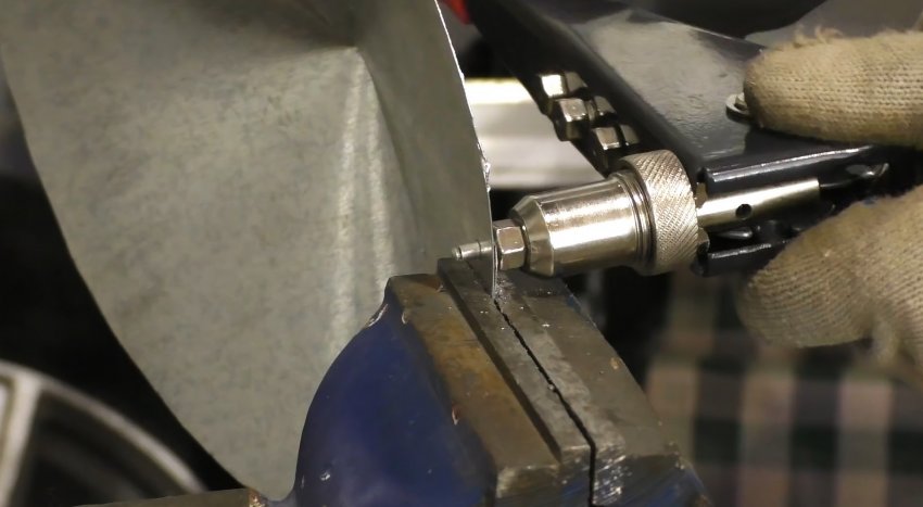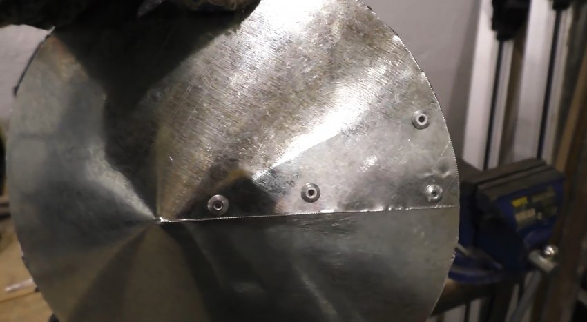 В завершение закрепляется экран из полосы, сделанной первой. Он накручивается вокруг дефлектора, и фиксируется на стойках заклепками.